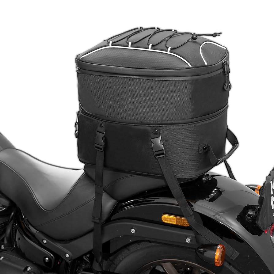 Sissy Bar Bags | Attaches to the sissy bar, providing additional storage without taking up space on the bike. | Custom builds, cruiser motorcycles. | Prós: Customizable, easy to attach/detach. Contras: Limited to specific bike types, less secure than hard bags. |