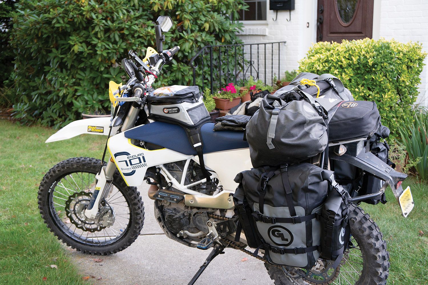 Introdução: bottled water, beef jerky, air pump, first aid kit, flashlight, small tent, condoms, cheese and bacon sandwich, full toolkit, zip ties, epoxy, rain gear, plastic garbage bags, tie-down straps, tire repair kit, foot pump, small electric pump, spare gloves, cheap multi-meter, disk lock, tote bags, yellow shammy towels, ran bags, combo locks, alcohol wipes, masks, blue gloves, Cliff bars, cargo net.